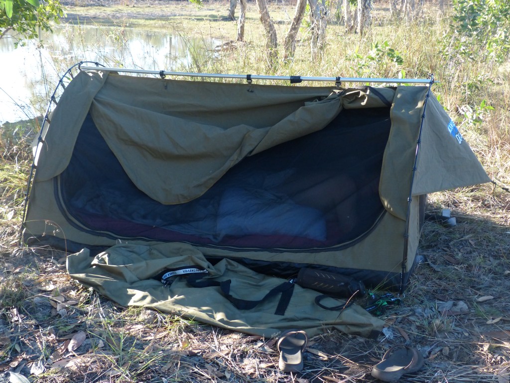 This time we headed north, north-east along the road to Chilagoe, came across a family of wild pigs, Mum & bubs went one way & Dad went in a different direction – clever animals. Obviously saw heaps of cattle all swanning around waterholes & the roadside, where the cattle were was also lotx of brolga’s. Drove past a few Station entrance’s – Van Rook was very eye catching. Crossed over the Gilbert River, it definately has the ‘wow’ factor but there was some rather large signs saying no camping etc so we drove on, after about 70klms we drove over a dry creek called Wyaaba Creek & turned left, there were a couple of waterholes(brown looking water), the area had been recently burnt out as there was still a few stumps still smouldering but then we came across a lovely fresh looking pond – our camp for the nite & we had a few critters around. We had a great little fire happening & Peter’s cooking definately hits the spot. It is always nice to get away & see different area.
