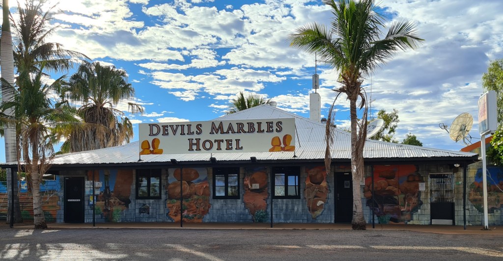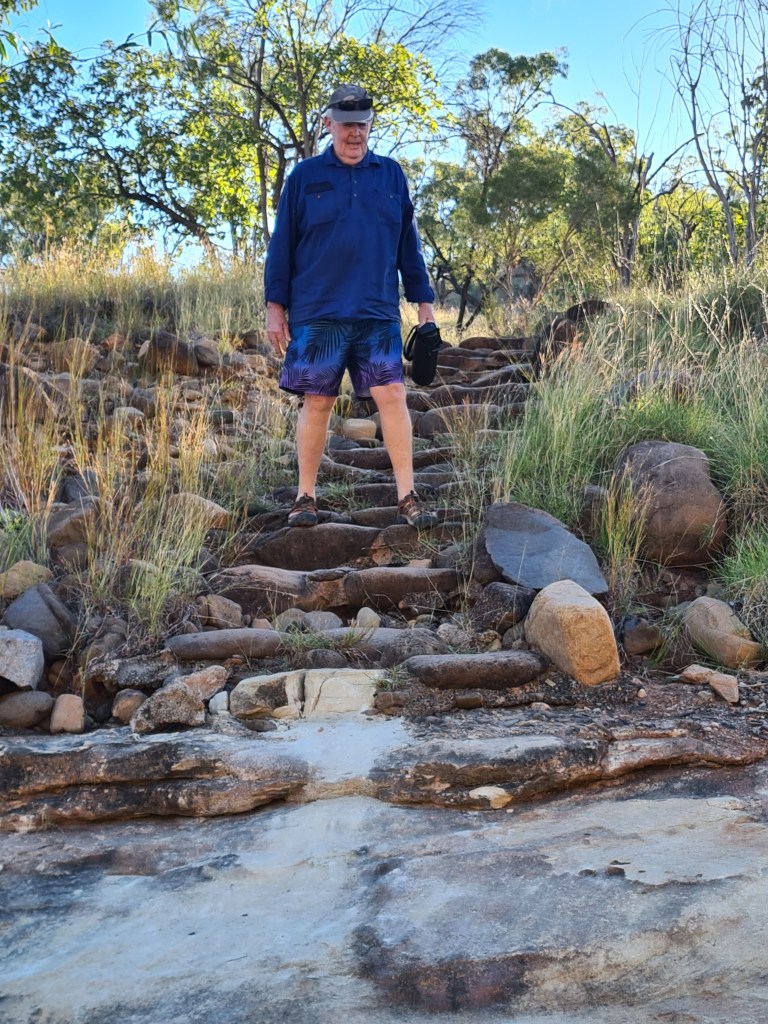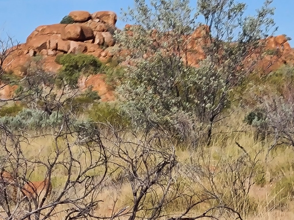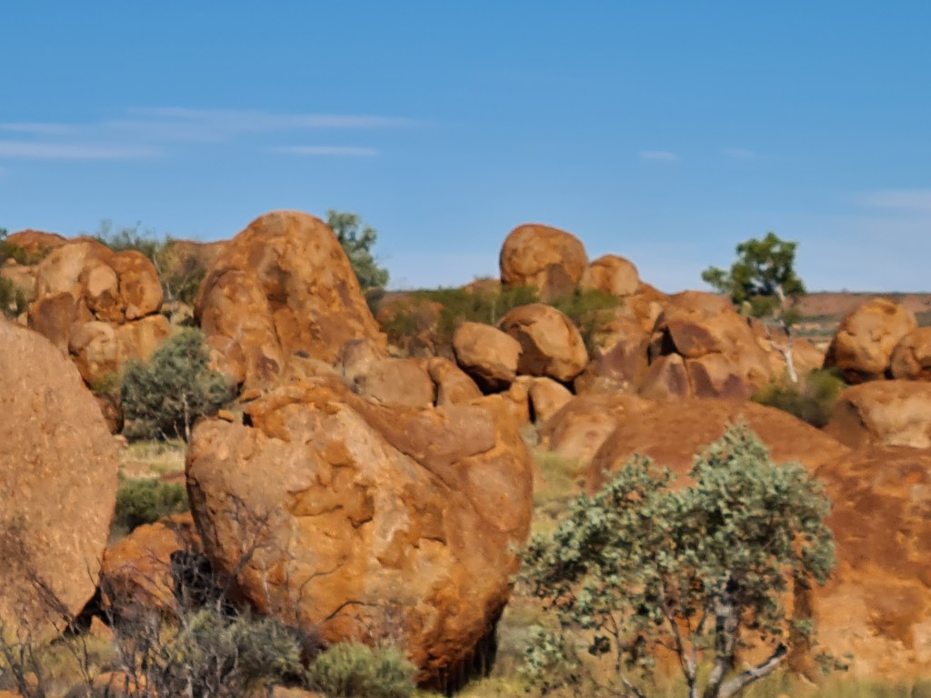 Next day drove through Mt.Isa although we did stop for some supplies, we camped up about 60klms east of Camooweal for the night, crossed the QLD/NT border next morning & called into Avon Downs rest stop & made some breakfast – very yum. The flowering lemon scented gums lined the Barkly & Stuart Highways – they were beautiful, we stayed at the Devils Marbles Hotel with more great mates, Sonja & Barry from Tasmania, we were very luck to catch up with them & enjoyed a lovely dinner & lotx of chatting.