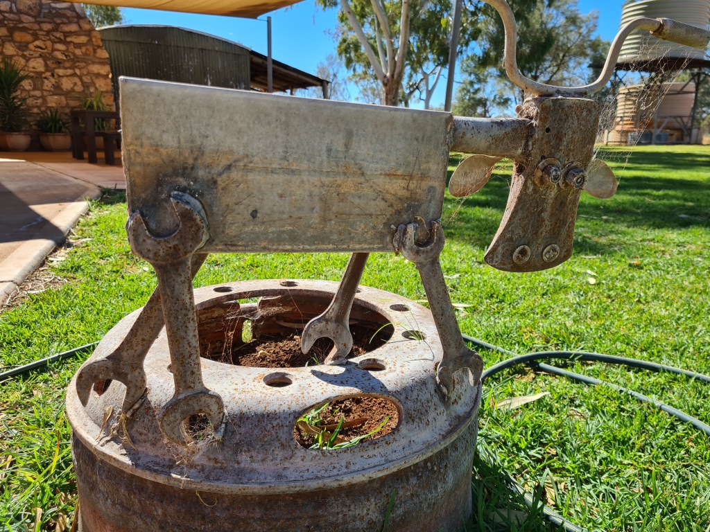 When the bosses are away we go to Hamilton Downs homestead & attend to the watering of the various plants & gardens. Hamilton Downs was the original place that we were supposed to be based at but plans changed just before we arrived, so we ended up at Amburla Station (which we are very happy about). Our bosses (Tony & Pam Davis) live in a cottage at Hamilton Downs when here, the manager lives in the main house & his worker lives in outside quarters – there are numerous sheds & buildings around with lotz of ‘stuff’. There is an old building which was the original hometead here, it now houses old saddle pads & harness yolks with some odds & ends. There are many old artefacts here at Hamilton which they are starting to try & preserve.