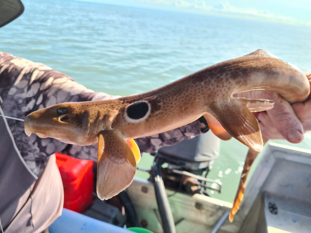 Last Sunday 24th April we took the boat out to a place called Cook’s reef( supposed to be good fishing area) & while fishing we saw lots of birds diving onto the water, big splashes etc so we thought it would be good to check out & maybe catch some mackerel. As we got closer there was a large dark mass in the water, the closer we got you could see heaps of fish & sharks, the dark mass was bait fish – 1000’s of them. The fish & sharks were going crazy, we stopped & threw lures in trying to catch some mackerel, Peter caught 2 sharks, I caught a tuna mackerel & 2 sharks – we gave up as it took ages to get sharks off our lines without losing our lures but it was fun & interesting. We then went back to another reef where we frequently fish, Peter caught a Tricky snapper(our dinner) & also a Epaulette shark (a real cutie).