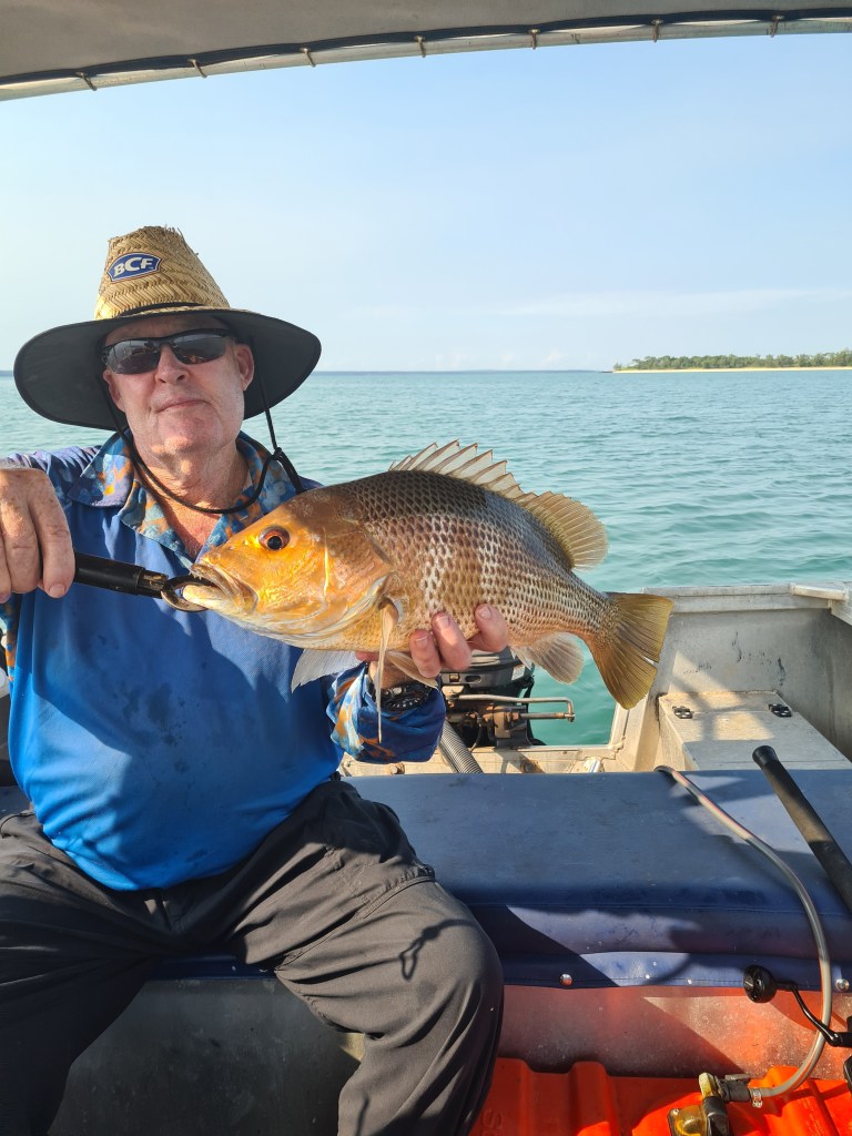Went out again on Monday – its so nice going out on the boat. We went to our usual reef area & tried a few different spots with success, 5 keepers – 2 x Golden snapper, 1 x Spangled emperor(also know as Green snapper), 2 x rock cod & 2 muddies. This time when we collected the pots the crocs had only played with 2 pots so not too many repairs. Not long after we got home, the boat cleaned & fish cleaning time – the rain started…..haha