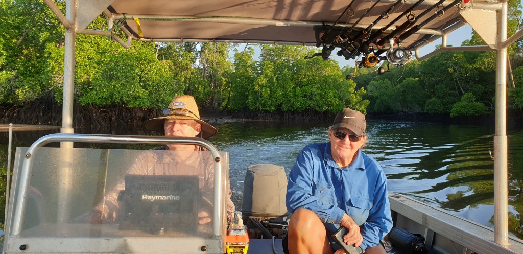 Early next morning, we had a quick breakfast & headed to the creek, WOW! what a beautiful looking day. The weather & sea ended up being amazing – soooooo nice. We put crab pots in & then went out fishing, we had great fun, saw dolphins, sharks & a few birds. Came home, cleaned fish, ate fish & played cards. Had an awesome day with awesome people.