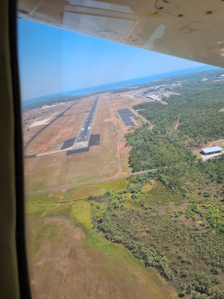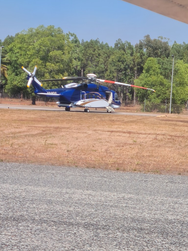 We flew out Sunday 24th July on a charter flight, Peter had to sit in the front seat next to the pilot, the flight took about 30 minutes, Snake Bay to Darwin. While we were boarding our plane a rather large helicopter was parked up on the apron of the landing strip – rather a large thing, apparently it is used for taking people in & out from the drilling rigs.