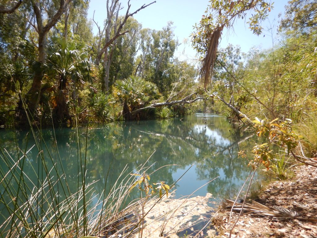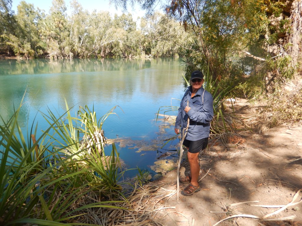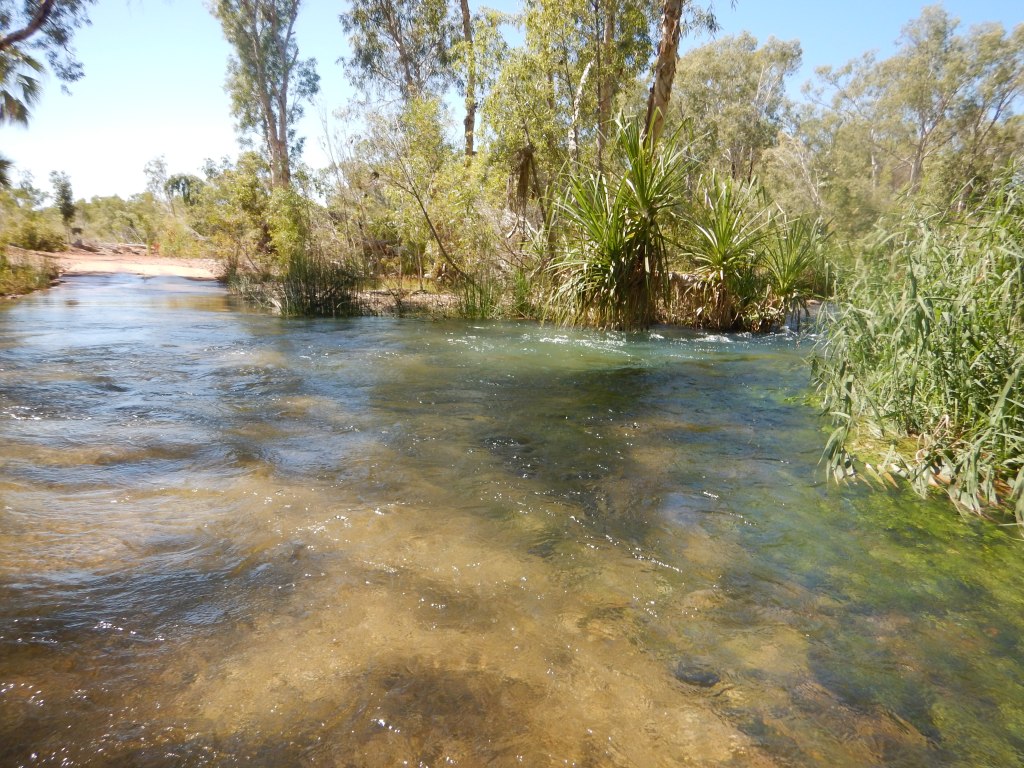Leaving Mt Isa along Barkly Hwy, the roadsides were filled with these beautiful Pink mulla mulla – so nice. Approximately 70klms east of Camooweal we turned north onto Yelvertoft/Thorntonia Rd then later onto Gregory Downs/Camooweal Rd then left onto Riverslea rd. Not sure why but we see heaps of vehicles ‘parked up’…….hahaha. Peter deflated the tyre pressure on ute & trailer to ensure less damage/easier ride. Just after Riveslea Station homestead we crossed over 2 water crossings & then ‘Miyumba Bush Camp’ appears, it is a part of the Boodjamulla National Park – we camped here for a few days, a nice spot, only 6 camp spots available. Over the few days we walked the river banks, upstream we came across a goanna on a mission & saw quite a few wallabies, downstream we saw a barra but caught 2 very nice sooty grunter(black bream), each day we had a waddle in our ‘spa’, very refreshing but nice. A few people camped but no more than 4 counting us while we were there.