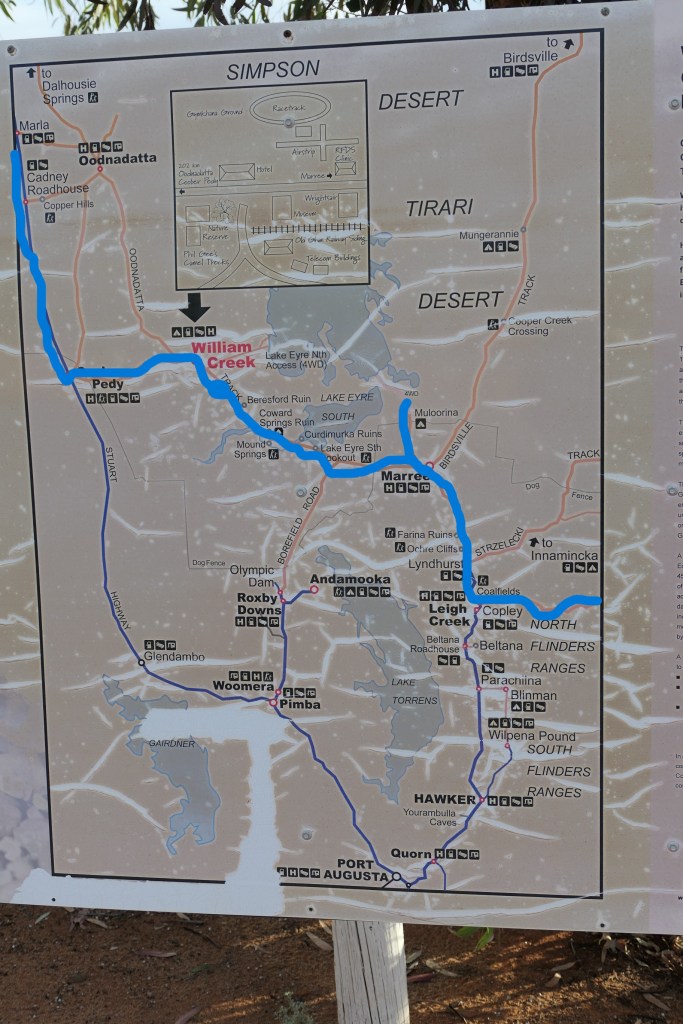 The blue line follows the track we drove, on the map Arkaroona Wilderness to Copely, Marree, William Creek, Cobar Peddy up the Stuart Hwy towards Alice Springs.