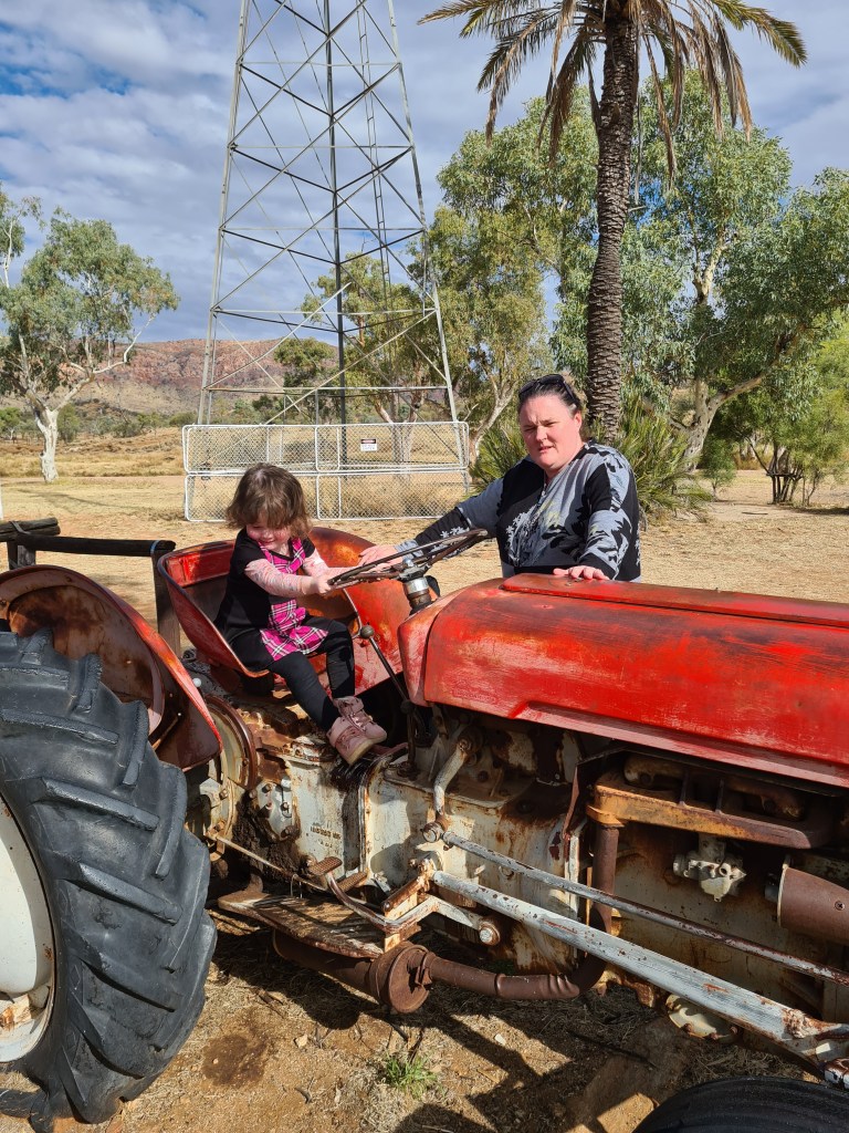Catherine & Georgia do a few rounds of the camp grounds when we don’t have clients or when they are out walking & she does an inspection of the ablution block, bunkhouses & kitchen area also checks out the red tractor.