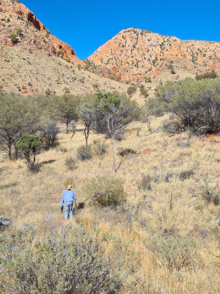 Here we go again, there is so much space here that our walks always take different tracks but can go in similar directions which always makes the walk interesting. From our cottage there is a visible ‘v’ within the Chewings Range in the West McDonalds which we are guessing is not far from from Standly Chasm(a popular visitors spot which is also a part of the Larapinta Trail). We have walked in this direction a few times & are gradually getting closer to the spot, usually we follow cow tracks so you can end up anywhere but it is always lost of fun. On our next walk we followed one of the creeks & walked up the other end of Drovers Hill (which is located behind the camp & a well used walk for the campers & school groups who come out here) – it was filled with lotz of ups & down so definately a good walkout.