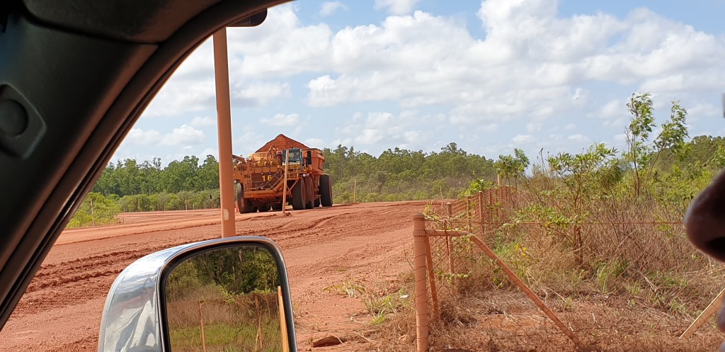 Cephalaria leucantha – apparently in the honeysuckle family.Old man’s beard also known as Travellers’ joy – apparently a noxious weed but still pretty.Golden guinea tree/Red beech – they are flowering everywhere at the moment – beautiful.Vito – Genipa americana – apparently a part of the coffee familyPoisonbulb/Swamplily/Spider lily, beautiful but not good for humans or dogs.Chinese Hibiscus/Shoeback plant/Rose mallow -has quite a few different names.Just got to love ‘fungi’……..Lotz of these fellows along the road as we were driving to Weipa.Before reaching Weipa town, we had to stop at the ‘haul road’ until we got the green light.This is a good reason to stop, he is much bigger than us.Even scarier when he gets closer…..Moreton Telegraph Station, gate shut so we didn’t venture in.The bridge over the Wenlock River on the Development Rd, next to Moreton Telegraph Station.There is a far distance between the water level and the bottom of the bridge.The Wenlock is so clear, clean & quite shallow in places. (quite inviting)When in flood this was our spa(when we did our stint at Moreton), its on a creek that runs into the Wenlock (approx 500m from river)