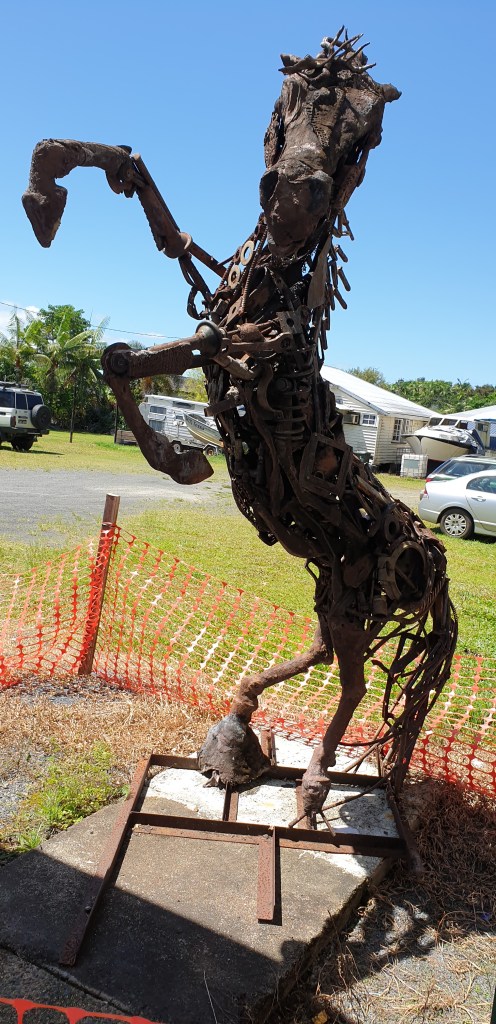Mandy overseeing the cooking – what a great job they both did.Hinchinbrook IslandMandy in her hometown of Cardwell.Driving through Tully, you cannot miss the sugar mill chimneys in full force, even in wet weather.Dinner at Cairns overlooking the bay.Dinner before we started.Dinner demolished – yummo.Saw this ginger plant flowering while walking the streets of Cairns.Bramston Beach ParkLotz of starlings were nesting in this particular tree, the night before we got here was windy & quite a few branches with nests were on the ground the next morning but there was hundreds of the birds.Beautiful elkhorns, orchids & ferns can be found just up from the beach.A flowering Beach Almond – the fruit is edible & just like a normal almond you buy in the store but smaller.We called into Babinda for a coffee & found this delightful sculpture – amazing how clever some people are.The allocated swimming area of the Babinda Boulders – quite lovely but a little too cool for us.It was great going for the walk…….