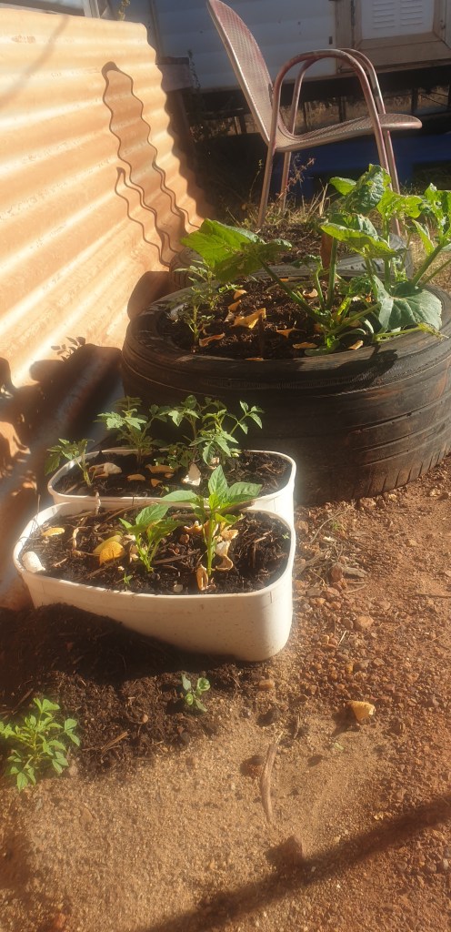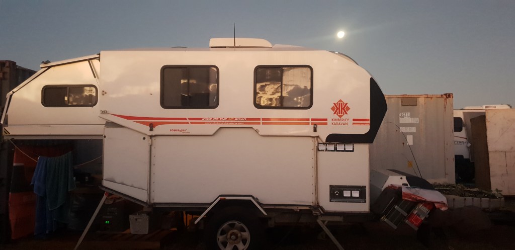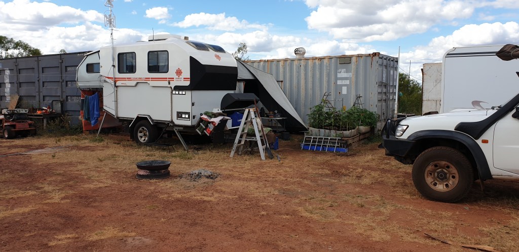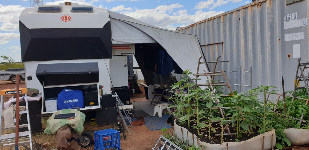 Our ‘KK’ setup is quite good, we have containers around us & a few caravans but all is good. We have a small vege patch & will have flowering sunflowers soon, the vege patch has had a hard life, one of the mechanics dogs took a liking to digging it up for me but things are stilll growing….haha