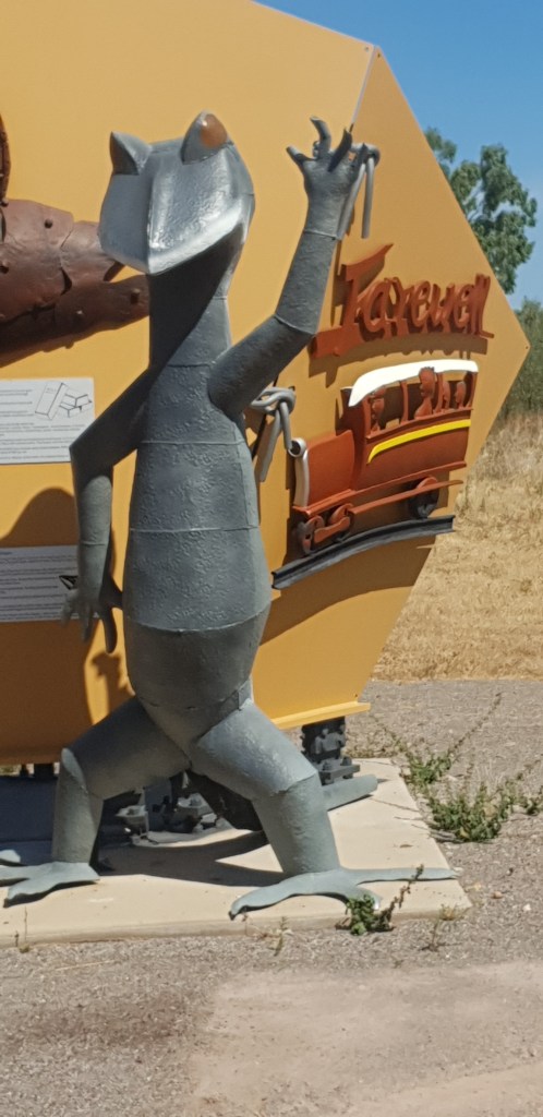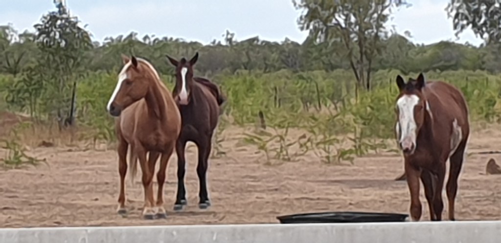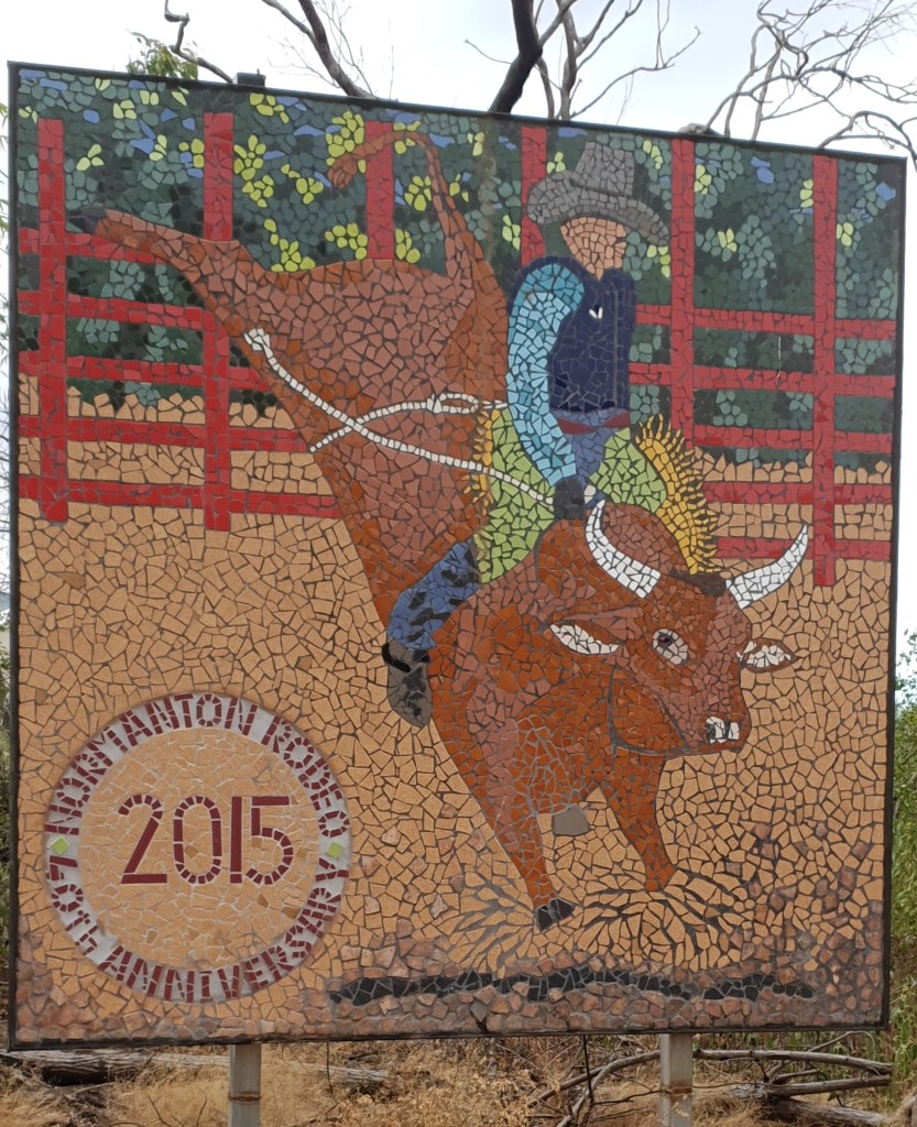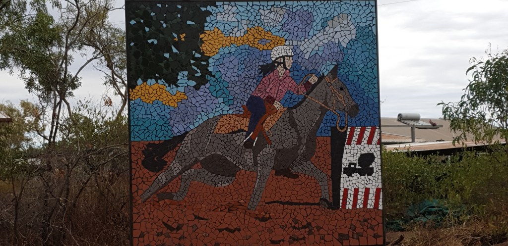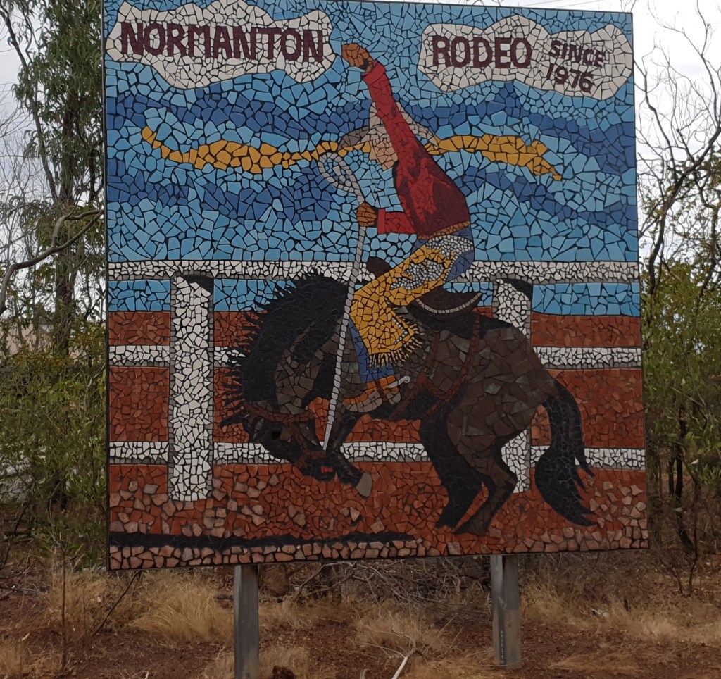 I have trying to do a little walking around the area, one of the blokes I work with is a keen walker so we do a few walks together. This day we walked behind the airstrip through a few paddocks & about 3 barb wire fences & came across the Normanton Race track, rodeo grounds, show ground & coucil pound – interesting. Came acroos a few happy critters in the shape of horses but not the racing kind. The mosaics at the road entrance to this joint are amazing.