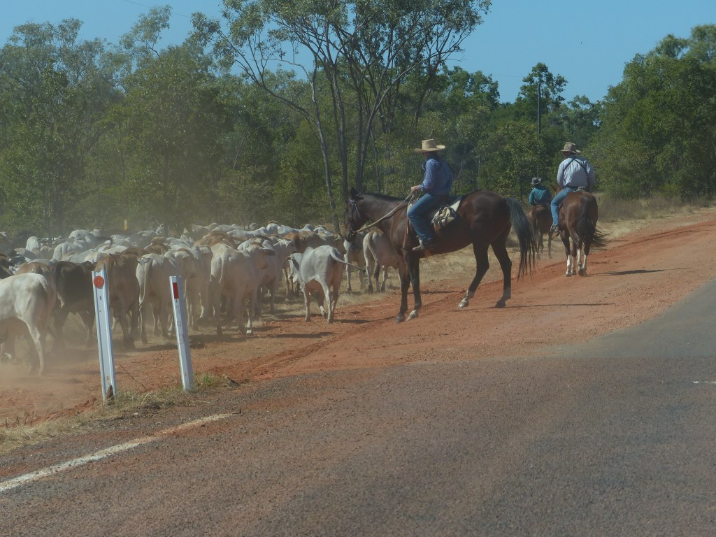 Fueling up in Kununurra.The WA/NT border – 8 hours before border checks heading east.We took our temperatures daily & documented them just in case there was an issues regarding our travels. Flowering grasses all along the roads.Drove through a storm prior to Elliot (NT), very beautiful rainbows & very heavy rain.Our camp at Renner Springs.Along the Barkly Highway, good to see some green grass.Driving towards the NT/QLD border – police & army stopping NT bound vehicles but waved us through, QLD closing border tonight at midnight.Welcome to QLD. Cows kissing cars………..Visitors at our camp at Mt Isa.Flinders River – a lovely camp spot.A red Frangipani – beautiful, found in the main street of Normanton.