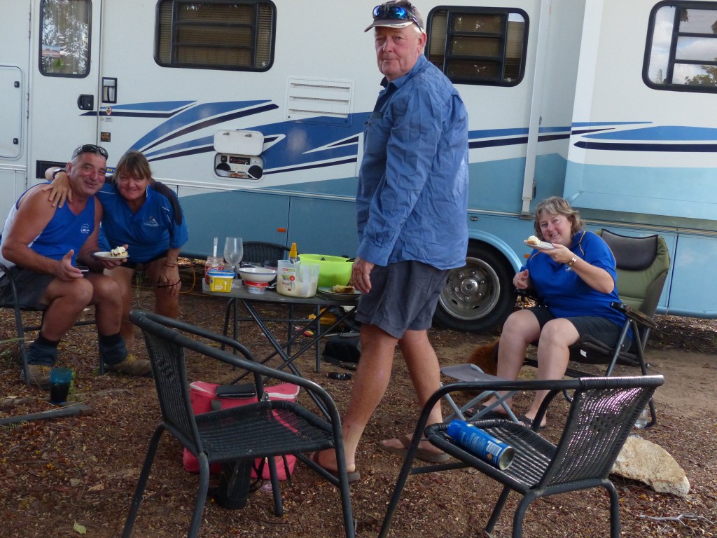 This time we headed north, north-east along the road to Chilagoe, came across a family of wild pigs, Mum & bubs went one way & Dad went in a different direction – clever animals. Obviously saw heaps of cattle all swanning around waterholes & the roadside, where the cattle were was also lotx of brolga’s. Drove past a few Station entrance’s – Van Rook was very eye catching. Crossed over the Gilbert River, it definately has the ‘wow’ factor but there was some rather large signs saying no camping etc so we drove on, after about 70klms we drove over a dry creek called Wyaaba Creek & turned left, there were a couple of waterholes(brown looking water), the area had been recently burnt out as there was still a few stumps still smouldering but then we came across a lovely fresh looking pond – our camp for the nite & we had a few critters around. We had a great little fire happening & Peter’s cooking definately hits the spot. It is always nice to get away & see different area.